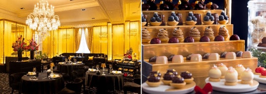 画像左:ガストロノミー “ジョエル・ロブション”内観/右:季節ごとに華やかな飾りつけが施された小菓子のワゴンには、 マカロンをはじめ、チョコレートやタルトなど20種類以上の小菓子が並ぶ