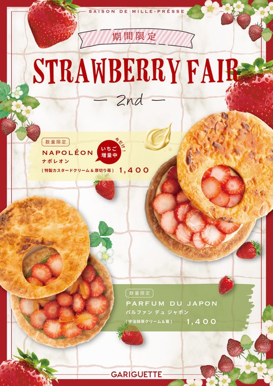 ガリゲットでは、春のシーズンイベントとしていちごフェア第二弾「ストロベリーフェア」を開催しております。今回の主役は、抹茶といちごの贅沢ミルフィーユ。