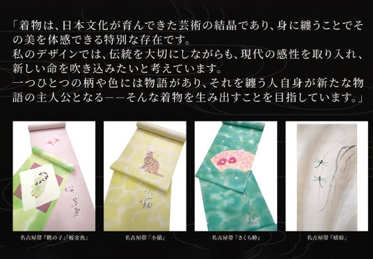 「着物は日本文化が育んできた芸術の結晶であり、身に纏うことでその美しさを体感できる特別な存在です。私のデザインでは、伝統を大切にしつつも現代の感性を取り入れ、新しい命を吹き込みたいと考えています。一つひとつの柄や色には物語があり、それを纏う人自身が新たな物語の主人公となる--そんな着物を生み出すことを目指しています。」
