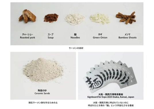 <写真:宇宙へ打ち上げる前のラーメンの原点の食材、陶器の砂、店舗看板>
