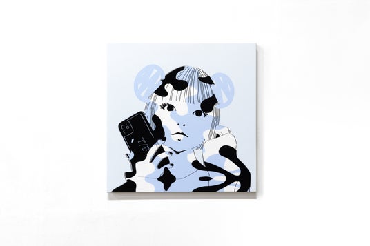 山口真人が描く女性たちは皆、どこかで出会ったことがあるような既視感を抱かせる。スマートホンを片手にカメラ目線で首をかしげる姿や、フィルターを合成して可愛さを演出する顔のアップ、それらは日々、SNSに大量に流れてくる見知らぬ誰かの姿を連想させる。示し合わせたように同じようなポーズでSNSに登場する若い女性たちの姿は山口にとって時代を映す存在であり、モデルとなる特定の人物やキャラクターがなくとも、見る人は思わず自分や身近な誰かの姿を重ね、親近感を抱くに違いない。そこにはかつてアンディ・ウォーホルが描いたマリリン・モンローに通じる時代の象徴性があり、国や言語を超えて漠然と共有される現代アジアの姿そのものが描かれているといえるだろう。