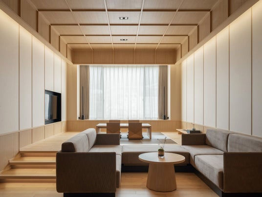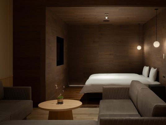 家族旅行で快適にお過ごしいただけます。高級感のある高い天井を持ち、寝室、リビング、小上がり(和室)を外に向かって一直線に並べ、開放感のある空間としました。寝室は木のボックスのようにデザイン。扉を閉めることで寝室を個室化することが可能です。