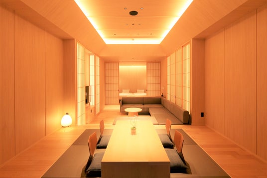 3世代でも宿泊可能な広さを誇ります。高級感のある高い天井を持ち、浴室、小上がり(和室)、リビング、寝室を外に向かって一直線に配置した和モダンなデザインのスイートルーム(suite-room)。浴室には横3.3m 高さ2.2mの大開口窓を持ち、その横幅全てを浴槽としました。