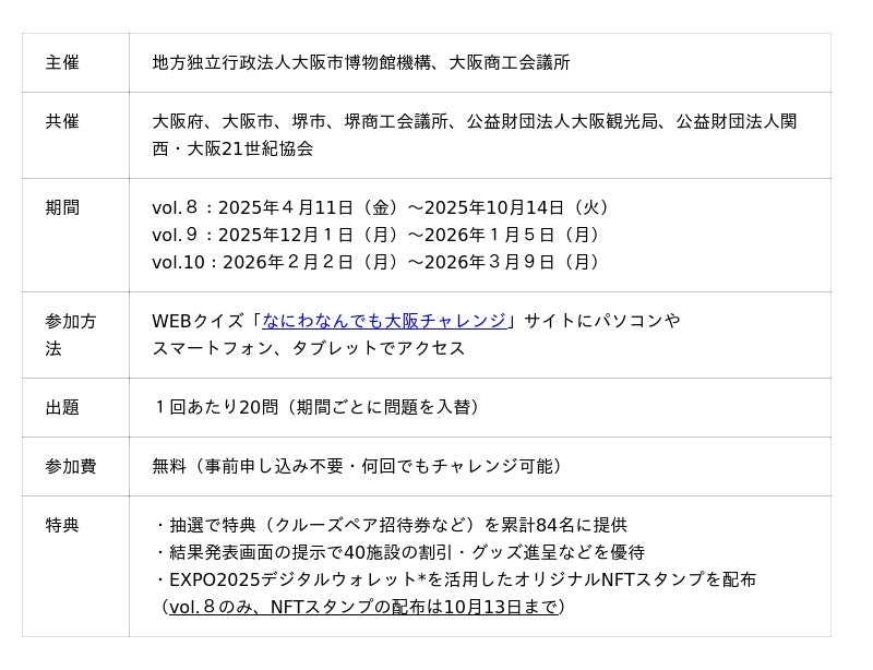 地方独立行政法人大阪市博物館機構(機構)と大阪商工会議所(大商)は、大阪が育んだ文化・風土のすばらしさを発掘・発信するWEBクイズ「なにわなんでも大阪チャレンジ」 vol.8を、万博来場者にも楽しんでもらうため、万博会期と連動して4月11日(金)から 10月14日(火)に実施します。