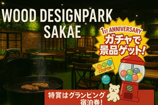 非日常感を味わえる店内で屋内型BBQスタイルが人気のレストラン「ウッドデザインパーク栄」は、オープン1周年を記念して、2025年4月23日より期間限定イベント「BBQガチャ祭り」を開催いたします。お食事金額に応じてチャレンジできるガチャでは、ウッドデザインパーク栄で使えるバーベキューフルコース無料券の他、グランピング場を運営する弊社からグランピング宿泊券など多数の豪華景品をご用意。感謝の気持ちを込めて、来店されたすべてのお客様に楽しんでいただけるイベントです。