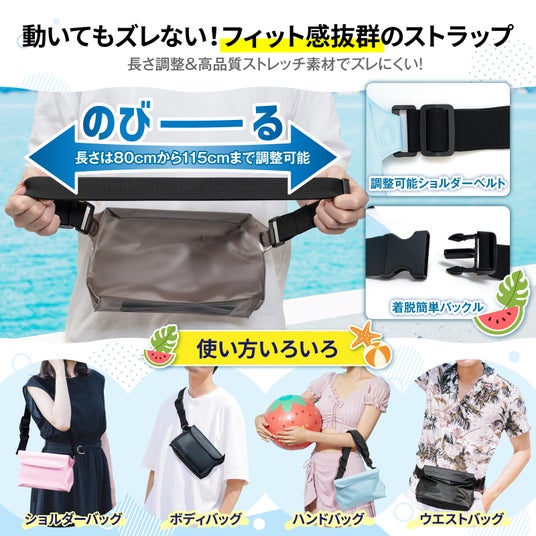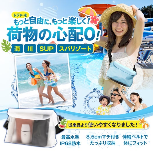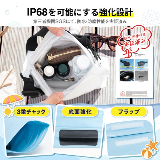 【完全防水ポーチ】海・プール・SUP・リゾートに最適!荷物がたくさん入るマチ付「ミズアソビPlus」新発売。スマホ、財布、貴重品も濡らさない。最高水準IP68で砂や埃からもしっかり守る。バッグとしても