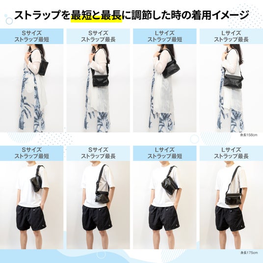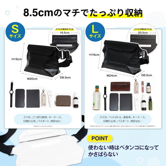 Sサイズでも8.5cmのマチを確保し、スマホ・ミニ財布・鍵などをしっかり収納。Lサイズでは500mlのペットボトルや長財布も余裕で収まります。