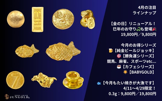 商品ラインアップ: これまでに500種類以上の純金商品をリリース。BABYGOLDシリーズや縁起物モチーフ、ジュエリーなど多彩なラインで展開。