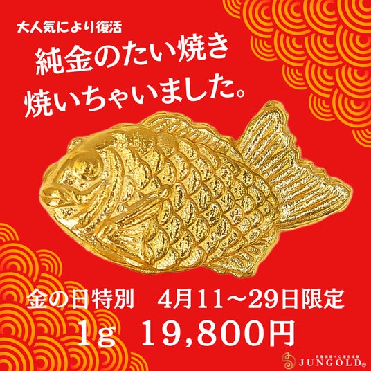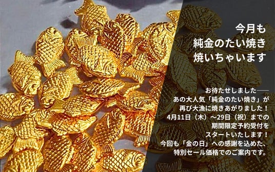 【GOLD新時代】資産になる「たい焼き」。あの「純金のたい焼き」が期間限定で再登場!。指先サイズのかわいい資産。4月11日~29日、金の日特別価格「1g 19,800円」で予約販売を実施中。