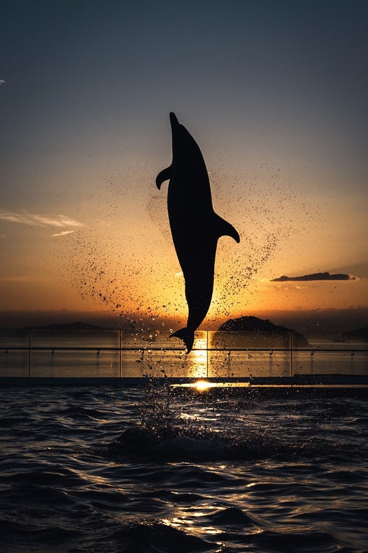 夕暮れ時に開催するサンセットプログラムでは、黄金色に染まる空を背景に、イルカのシルエットが浮かび上がる、まるで絵画のような景色をご覧いただけます。