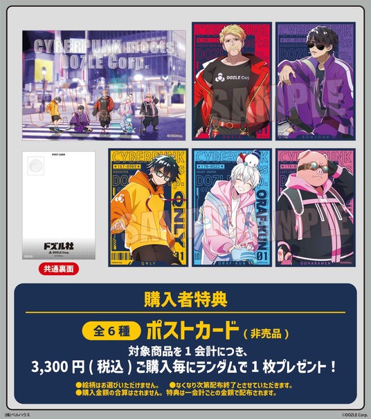 ドズル社関連商品(描き下ろしグッズ・オフィシャルグッズいずれも対象)を1会計で税込3,300円ご購入毎に、ノベルティポストカード(全6種)をランダムでプレゼントします。