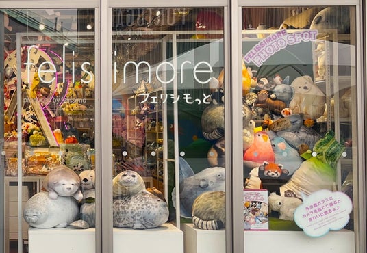 正面入り口で目を引くのが、窓ぎわいっぱいに積み重なる動物たち。店内に入ってパネルの丸抜きから顔をのぞかせると、もふもふの動物に包まれるという妄想が叶う写真を撮ることができます。