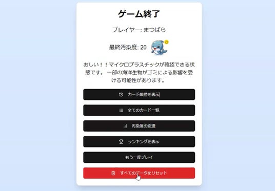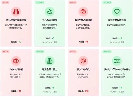 プレイヤーがゴミ問題に関するイベントカードとアクションカードを引いて、選択した行動によって海の汚染度が変化するゲームを作成。エンターテイメント性を保ちながら、個人の選択が環境に与える影響を実感できる設計となっており、楽しみながら環境意識を高められる体験を提供しています。