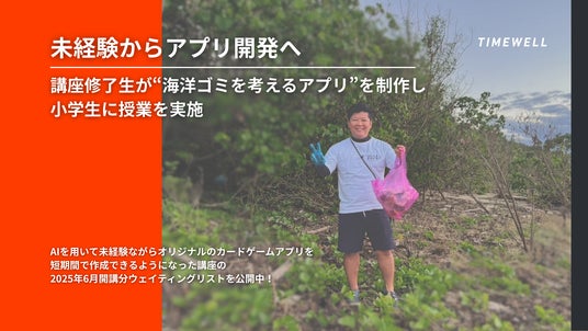 株式会社TIMEWELL(本社:神奈川県横浜市、代表取締役:濱本隆太、以下「TIMEWELL」)はTIMEWELLが提供する若手テクニカルアントレプレナー「WARP」の修了生 松原英考氏が海洋ゴミを考えるアプリを作成し、石垣小学校の小学生へ授業を実施したことをお知らせします。WARPは2025年6月開講分のウェイティングリストを公開しており、登録いただいた方には募集開始のタイミングで通知いたします。