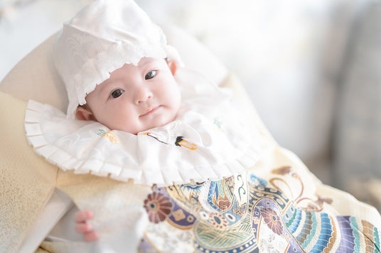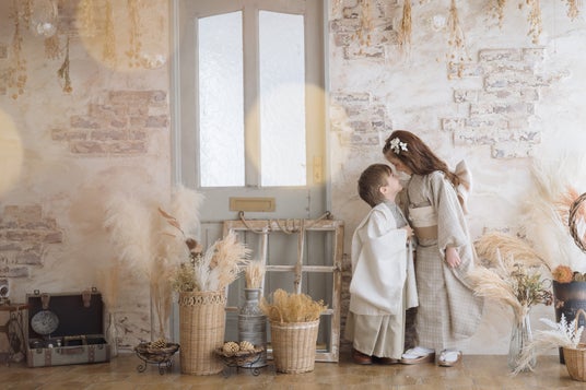 特に、ビンテージとは異なる味わいのコフレオリジナル和装は七五三撮影でも大変人気が高く、ごきょうだいやご家族様のトータルコーディネートのご提案や、お⾐装のレンタルも可能です(※4)。お宮参りの産着レンタルサービスも承っており(※5)、撮影前後1か月の期間であれば無料でご利用いただけます。