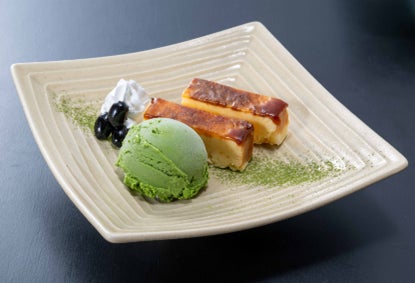 『宇治の濃厚抹茶あいすとカタラーナ』 税込720円 宇治の濃厚抹茶あいすに、サガミ定番のデザート、カタラーナを組み合わせました。カタラーナの濃厚な味わいとふっくらやさしい甘さの北海道産光黒が、宇治抹茶の香り・甘さと渋みをより一層引き立たせた逸品です。