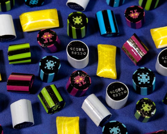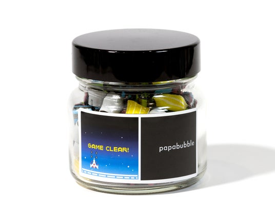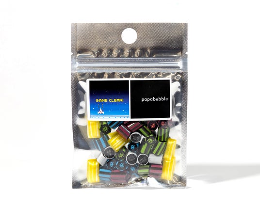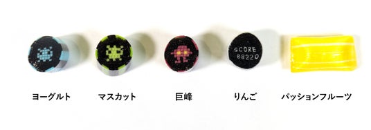 黒を基調に、宇宙人をドット絵風に再現したピクセルキャンディ。1粒に、通常の絵柄の約3~5倍となる60個以上のパーツを使用し、職人がひとつひとつ丁寧に組み上げた、まさに技の結晶です。スコア柄の数字部分はランダムで仕上げているので、ぜひ注目して楽しんでみてください。