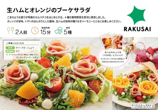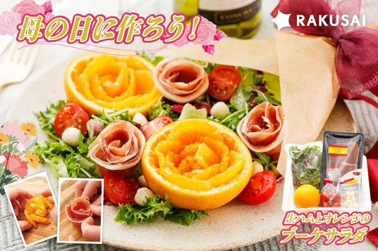 d130004-77-e96738a20ff82dc7d14d15f88ab79483.pdf 楽彩株式会社(本社:東京都足立区/代表取締役社長:大崎善保)は、5月「母の日」にあわせて『生ハムとオレンジのブーケサラダ』を2025年4月14日(月)より販売いたします。「母の日の食卓を華やかに彩りたい方に」「料理の手間をかけずに、特別感を演出したい方に」「健康志向のお母様に」おすすめの母の日を彩るサラダです。日頃の感謝の気持ちを込めて、大切なお母様に華やかなブーケサラダをプレゼントしてみませんか。