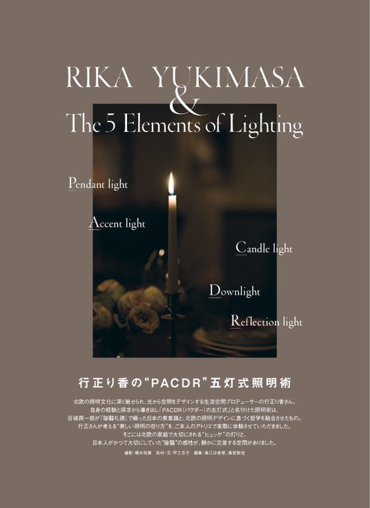 行正り香の“PACDR”五灯式照明術北欧の照明文化に深く魅せられ、光から空間をデザインする生活空間プロデューサーの行正り香さん。自身の経験と探求から導き出し「PACDR(パクダー)の五灯式」と名付けた照明術は、谷崎潤一郎が『陰翳礼讃』で綴った日本の美意識と、北欧の照明デザインに息づく哲学を融合させたもの。行正さんが考える“美しい照明の在り方”を、ご本人のアトリエで実際に体験させていただきました。そこには北欧の家庭で大切にされる“ヒュッゲ”の灯りと、日本人がかつて大切にしていた“陰翳”の感性が、静かに交差する空間がありました。