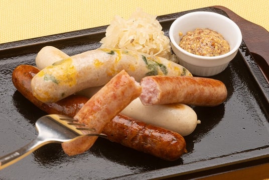 (あらびきソーセージ・ピリ辛ビヤソーセージ・ヴァイスヴルスト・ほうれん草とチェダーチーズのソーセージ)