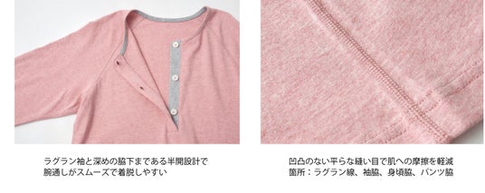 乾燥機対応の綿100%天竺素材を使用し、着脱時の腕通りがスムーズになるラグランスリーブ、深めの股ぐりで身体を丸めてもお尻が隠れる設計、肌との摩擦が軽減されるフラットシーマ縫製などを採用いたしました。