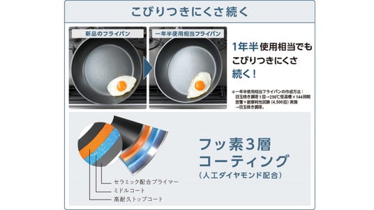 フッ素3層コーティング(人工ダイヤモンド配合)を採用し、こびりつきにくさにこだわっています。社内検証の結果、1年半使用相当でも、こびりつきにくさが長続きします。