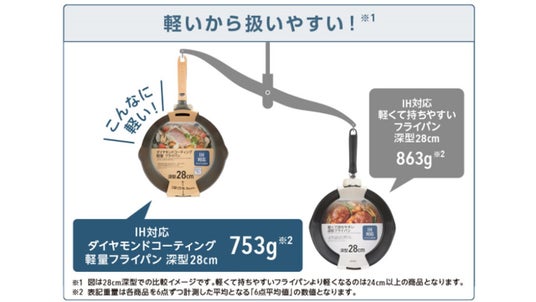 一例としてIH対応深型28cmの重量は約753gで、「ホームコーディ IH対応軽く持ちやすいフライパン深型28cm」より約13%の軽量化を実現しています。