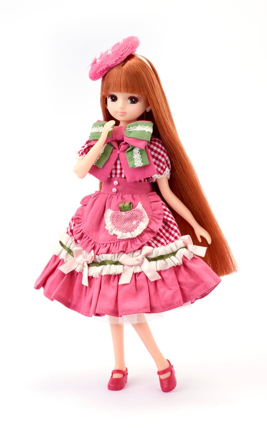 いちごをモチーフにしたシンボルドレスを着たリカちゃんです。