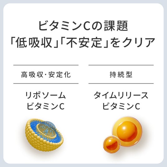 【特徴1】高吸収×持続型ビタミンC「リポソームビタミンC」と「タイムリリースビタミンC」の2種類を採用し、安定性と吸収効率を最大化しました。 1日2包で3,000mgのビタミンCを補給していただけます。