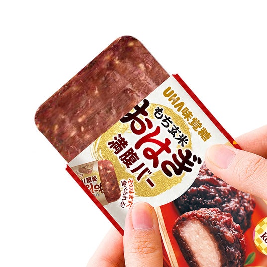 これまでの[十六雑穀プラスほんのりしお味][ごま鮭][鯛と帆立の出汁仕立て][焼きおにぎり風味][キーマカレー風味]の5フレーバーに新たに「おはぎ」が加わりました。口に入れるともちっと、噛むとぷちっと心地よい玄米特有の2つの食感がほんのりとした甘さを惹き立てます。玄米を普段の食事に取り入れたいけど、食感独特の触感がちょっと苦手…という方にも心地よいもっちりぷちぷちとした食感をお楽しみいただけます。これまでは主食に近い風味が多かった満腹バーシリーズに、ご要望の多かった「ほんのりとした甘みのあるフレーバー」を取り入れることで、間食や食後のおやつとしてもお楽しみいただけるラインナップが登場しました。
