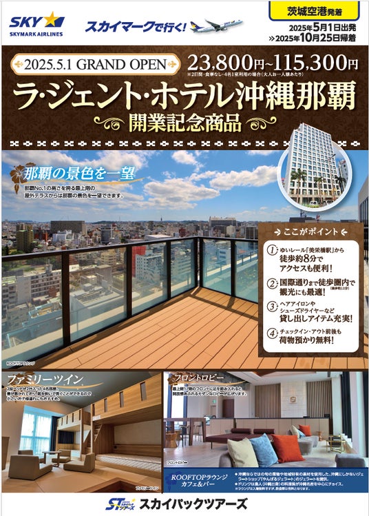 スカイパックツアーズ株式会社(本社:東京都中央区、社長:横山正巳)は、スカイマークを利用した価格固定型のパンフレット旅行商品「スカイマークで行く沖縄 ラ・ジェント・ホテル沖縄那覇」【茨城空港発着】(2025年5月1日出発~10月25日帰着)の販売を開始します。
