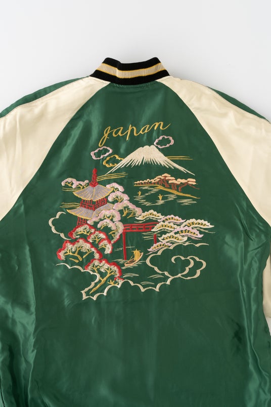 刺繍は、TAILOR TOYOが所蔵しているヴィンテージスカジャンの中から柄を厳選し、2着のA面(主役となる面)を1着に落とし込んだ「両A面」仕様。1950年代前半のヴィンテージに準じたブラック×ブラックのボディには白龍を、グリーン×アイボリーのボディには日本の春の風景を鮮やかに表現しました。
