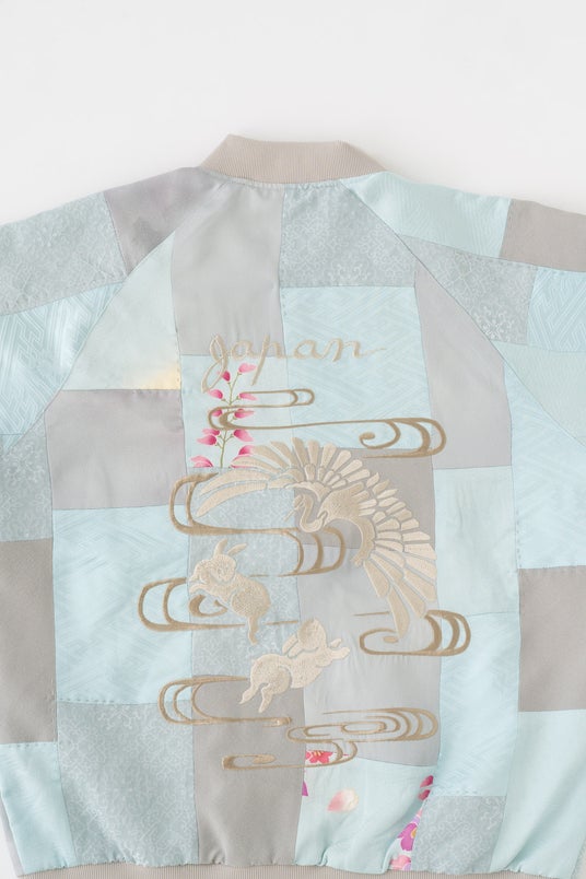 スカジャンの特徴であるリバーシブル仕様や刺繍のディティールを活かしながら、和装の象徴的な「袖」や「衿」を取り入れた新しい「キモノ」。