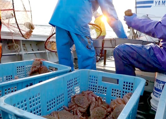 エサをつけた台形型のかごを海底に沈め、数日後にかごを引き上げることでエサに引き寄せられてカゴに入った毛がにを漁獲します。これにより、毛がにに傷をつけず品質を保つことができます。また、育ったオスだけを漁獲し、サイズの小さいものやメスの毛がには海へ戻す、獲るだけではない「育てる漁業」に取り組んでいます。
