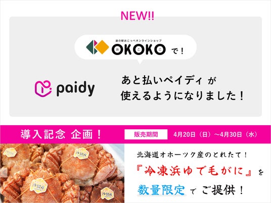おこっぺ町観光協会が運営する、道の駅おこっぺオンラインショップ『OKOKO』の決済にあと払いペイディ導入による記念企画を開催します。