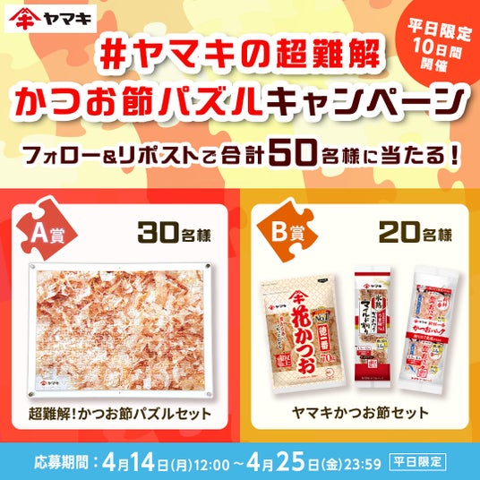 ヤマキ株式会社(本社:愛媛県伊予市 代表取締役社長:城戸善浩 以下ヤマキ)は、2025年4月14日(月)12:00より、Xアカウントにて「#ヤマキの超難解かつお節パズルキャンペーン」を開催します。