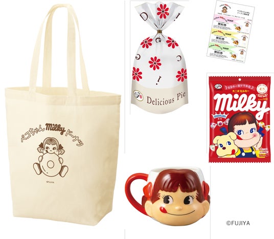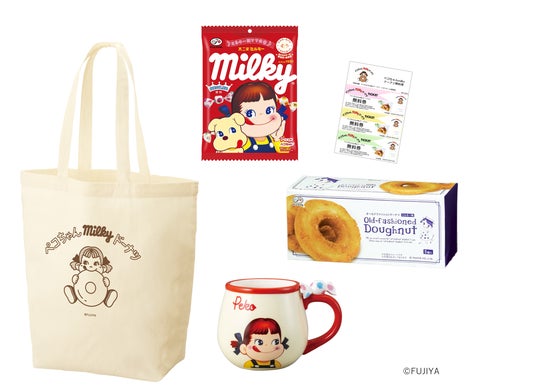 「ペコちゃんmilkyドーナツ」ロゴが入ったオリジナルのトートバッグに、不二家のお菓子やグッズなどを詰め合わせました。お得なドーナツクーポン付きです。