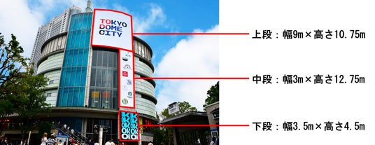 「ミーツポートビジョン」は、上段(幅9m×高さ10.75m)、中段(幅3m×高さ12.75m)、下段(幅3.5m×高さ4.5m)の3面で構成された大型ビジョンです。東京ドームシティの南東エリアに位置する複合施設「MEETS PORT(ミーツポート)」の地上1~5階の外壁に設置されています。