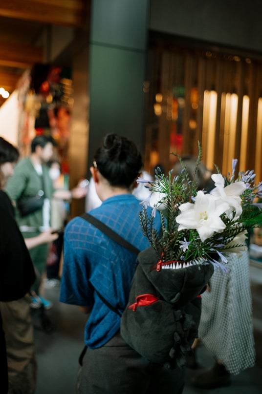 「Anything but a Vase (花瓶以外の入れ物を持参して) 」と名付けたこのイベントでは、週末にエースホテル京都で開催される婚礼で花嫁を彩り、会場を華やかに演出していた花々を再活用します。翌日にはまだ美しく咲いていても、通常であれば廃棄されてしまうこれらの花材を、参加者ご自身のお気に入りの容器(花瓶以外でもOK)に活けてお持ち帰りいただきます。シンプルなアップサイクルの体験を通して、私たちが暮らす地球について、楽しみながら考えるきっかけとなるイベントです。昨年(2024年)に開催したした際は、ファッションの一部としてブーツやズボンのポケットに装飾ししたり、カバンに入れて持ち帰ったり多くの参加した方たちがユニークな方法で持ち帰っていきました。