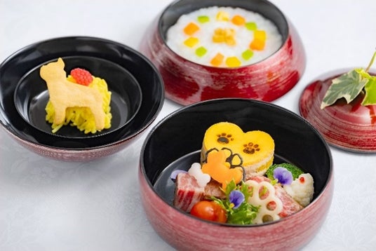 館内1階に配置する、8室の個室を備えた全13卓52席のダイニングでは、愛犬とともに夕食・朝食をお楽しみいただけます。夕食には、ゆったりと美食を堪能できる「モダン懐石」を提供し、愛犬用の食事も別途料金でご用意可能です。また、朝食は、和洋いずれかをお好みでお選びいただけるほか、4月から11月にかけては、テラス席で自然豊かな箱根の空気を肌で感じながらお召し上がりいただけます。