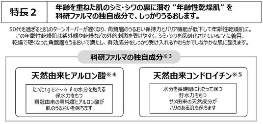 シミ対策※2とシワ改善のための医薬部外品有効成分に加えて、年齢を重ねた肌のシミ・シワ悩みの深刻化を促す “年齢性乾燥肌” に着目した科研ファルマ独自の保湿成分、さらにはエイジングケア※3のために厳選した保湿成分を配合した「総合エイジングケア※3」で、シミを防ぎながらシワを改善し、透明感※4 あふれるなめらかハリ肌を目指します。