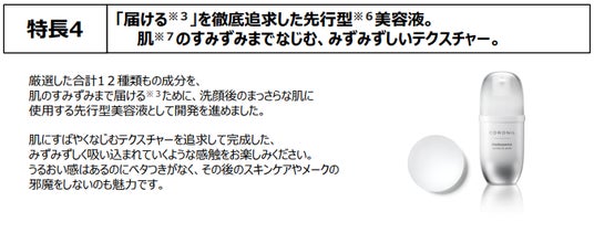 ※1 年齢に応じた化粧品によるお手入れ ※2 水溶性コラーゲン液(魚起源) ※3 角質層まで ※4 うるおいによる ※5 酵母エキス(1) ※6 洗顔後にローションなどより先に使うアイテムのこと ※7 角質層