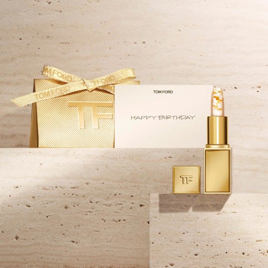 Happy Birthdayの祝福のカードとともに、トム フォードの人気ギフト「リップ ブラッシュ」をお贈りする、華やかなバースデーボックス。