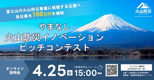 山梨県(知事:長崎幸太郎)では、富士山火山防災に関する課題解決を目指し、民間企業との共創による取り組みの第一歩として、富士山科学研究所の知見と、産業界が有する最先端の技術を加えた集合知を最大限に活用するために、『やまなし火山防災イノベーションピッチコンテスト2025』を開催します。