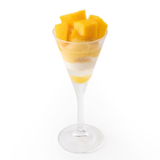 Time limited menu 平日時間帯限定メニュー 自家製マンゴーシャーベットのミニパフェマンゴー特有のトロピカルな香りを感じる店内製造シャーベットと、マンゴーオレンジソース、コアントローゼリー、ディプロマットクリームを重ねたパフェです。