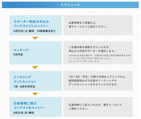 コンテストへのプレエントリーとして申し込みいただき、岡山ガス社員とのミーティングを通し て、プランのブラッシュアップにお役立てください。