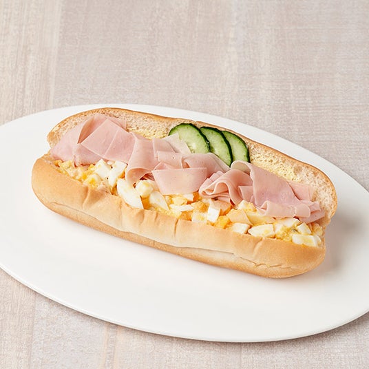 【内容】薄切りのハムと、ハム・たまご・ピクルスを使用した満足感あるたまごハムサラダをあわせた黄金コンビが楽しめるロールパンです。