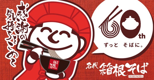株式会社小田急レストランシステム(本社:東京都渋谷区 代表取締役社長:深海尚)が運営する「箱根そば」は、2025年8月で60周年を迎えます。小田急沿線にお住まいの皆さま、そして、沿線をご利用の皆さまにご愛顧いただいた感謝の気持ちと、これからも地域の皆さまのソウルフードとして共に歩んでいきたいという想いを込めた「ずっと そばに。」をスローガンとして掲げ、2025年度は通年でイベントを実施していきます。また、マスコットキャラクターの「やっこさん」も、60周年の還暦にちなみ“赤いちゃんちゃんこ”と“頭巾”を身にまとい、アニバーサリーイヤーを盛り上げます。