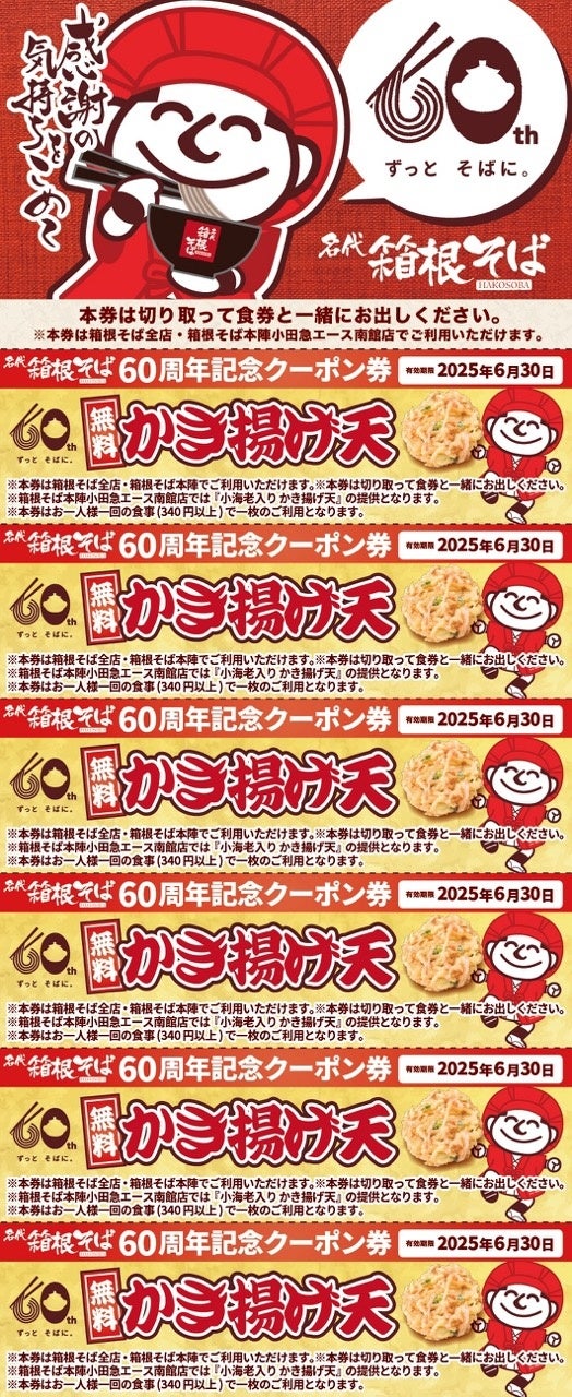 周年企画の第一弾として、2025年4月16日(水)からお食事をされたお客さまに「箱根そば60周年記念クーポン券」を数量限定で無料配布します。箱根そば自慢の「かき揚げ天」クーポン券が6枚綴りになった大変お得なクーポンで、箱根そば全店・箱根そば本陣小田急エース南館店をご利用いただいたお客さまにお渡しします。