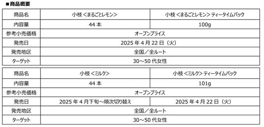 森永製菓株式会社(東京都港区芝、代表取締役社長COO・森 信也)は、ロングセラーチョコレート「小枝」から、レモンを皮ごと練り込み、レモンの香りが引き立つ「小枝<まるごとレモン>」「小枝<まるごとレモン>ティータイムパック」を4月22日(火)より新発売いたします。